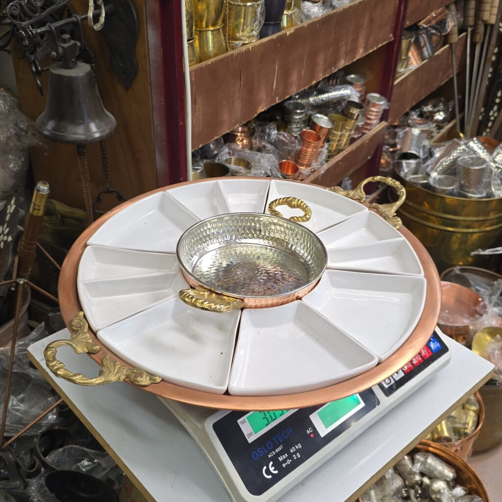 Ürünümüz tamamen el işçiliğiyle hazırlanmıştır. 0,80mm kalınlıkta bakırdan imal edilmiştir. Dış kısımdaki işlemeler bakır ağır kalem işçiliğidir. Çerez, meze, şeker